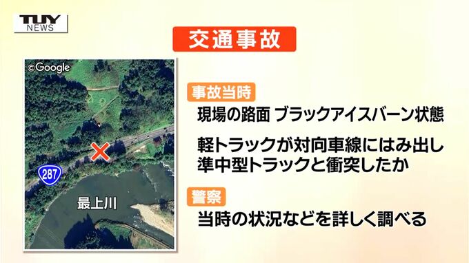 警察によりますと事故当時、現場の路面はブラックアイスバーン状態となっていて、軽トラックが滑って対向車線にはみ出し、準中型トラックに衝突したとみられています。