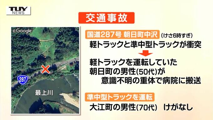 警察によりますと、けさ6時すぎ、朝日町中沢の国道287号で、軽トラックと準中型トラックが衝突する事故がありました。