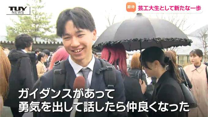 「あなたの心の涙を絵具に」東北芸術工科大学の入学式 若者が夢と希望を胸に新たな一歩 "芸術家の卵" たちの抱負は?(山形) 2025年4月3日(木) 18:54 国内 ■早速、仲良くなった4人組も。 新入生たち「(Qいつ仲良くなった?)ガイダンスがあってその時に勇気を出して話したら仲良くなった」 決意を新たに芸術の世界に飛び込んだ若者の新な生活が始まります。