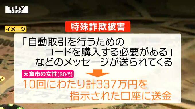 女性は指示に従い、10回にわたり合わせて337万円を指示された口座に送金したということです。