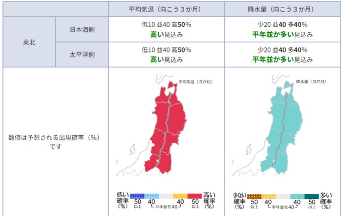 東北日本海側:平年並か多い見込み 東北太平洋側:平年並か多い見込み