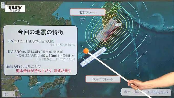 今回の地震は、カムチャツカ半島の1つの地点が発生源ではない。なんと、プレートに沿ってかなりの大きさの海底が動いたという。