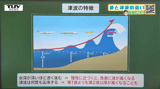 その理由は、後ろの波が追いつくから。津波は増幅され、結果的に岸では大きな津波に成長するのだ。