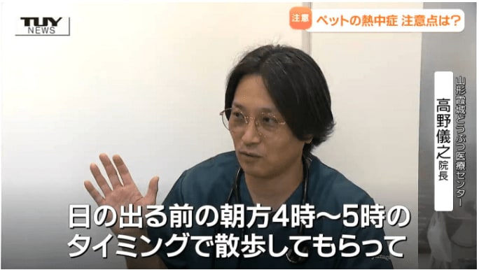 山形霞城どうぶつ医療センター高野儀之院長「人間が触ってみて(地面が)熱いと思う温度は、イヌやネコにとっても、とても熱い。日の出る前の朝方4時~5時のタイミングで散歩してもらって、夕方は日が沈んでからなるべく気温が下がったタイミングで(散歩)するのが良い」