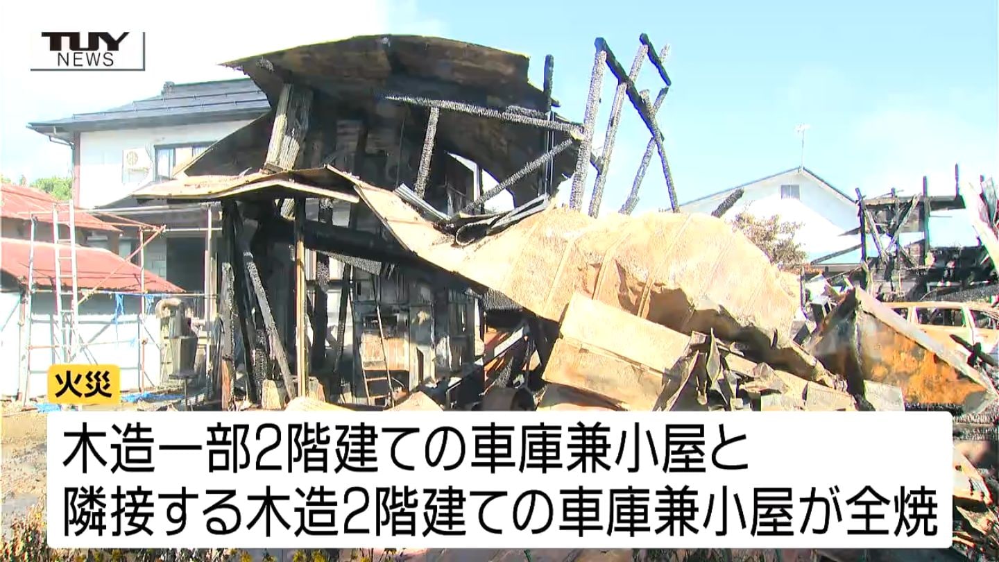 この火災で木造一部2階建ての車庫兼小屋とそれに隣接する木造2階建ての車庫兼小屋のあわせて2棟が全焼しました。ケガ人はいませんでした。