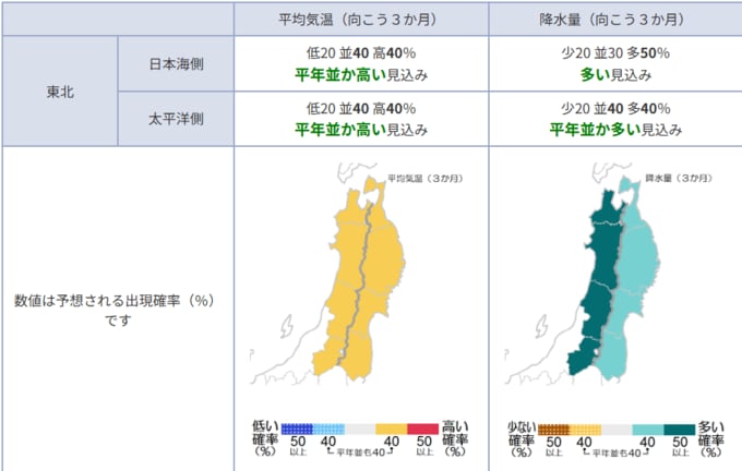 東北日本海側:平年並か高い見込み  東北太平洋側:平年並か高い見込み