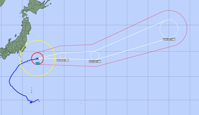 台風の中心は、12時間後の10日3時には日本の東の北緯34度10分、東経149度35分を中心とする半径65キロの円内に達する見込みです。中心の気圧は960ヘクトパスカル、中心付近の最大風速は40メートル、最大瞬間風速は60メートルが予想されます。予報円の中心から半径210キロ以内では風速25メートル以上の暴風域に入るおそれがあります。