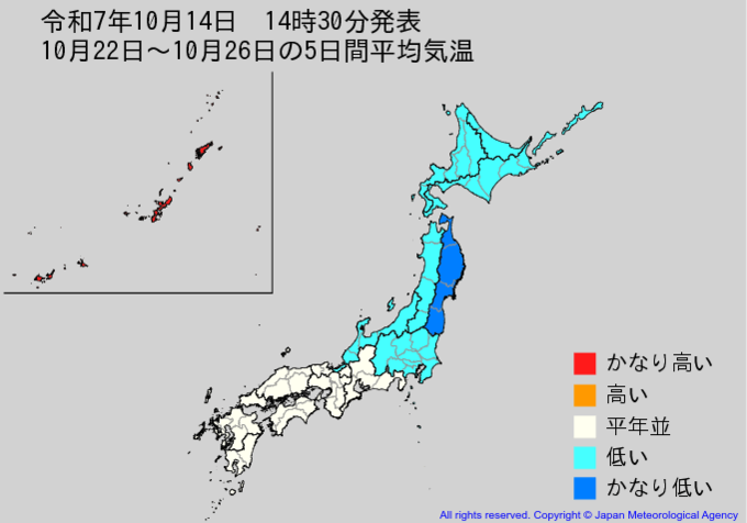 【2週間気温予報】北日本の気温は向こう5日間程度は平年並か高い日が多い予報 その後はかなり低い日も...農作物の管理などに注意 東北・全国の天気を画像で 気象庁 2025年10月14日(火) 16:27 国内 ■10月22日~10月26日の5日間平均気温 画像は気象庁より ・8日先から12日先まで5日間平均した日平均気温を表示しています。 ・かなり高い(かなり低い)は、かなり高い(かなり低い)気温となる確率が30%以上のときに表示します。