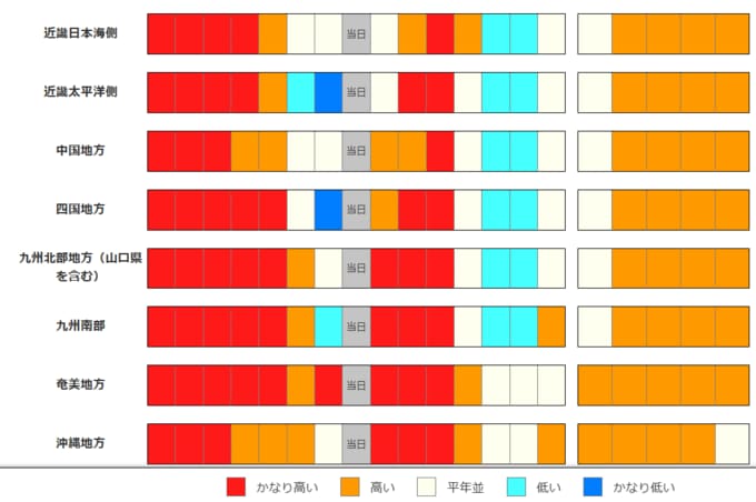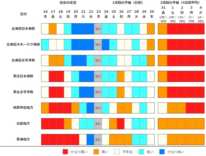 ・2週目の予報は中心の日に前後2日間を加えた5日間の平均(平均気温の5日間平均)です。平均期間は中心の日の下に表示しています。2週目のかなり高い(かなり低い)は、かなり高い(かなり低い)気温となる確率が30%以上のときに表示します。