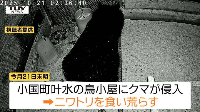 町によりますと、今月21日未明に小国町叶水の農家の鳥小屋にクマが侵入し、ニワトリを食い荒らす被害が置きました。