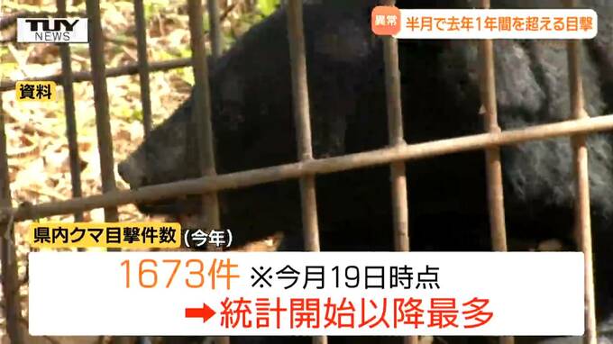県によりますと、今年県内でクマが目撃された件数は、今月19日時点で1673件に上りました。統計をはじめた2003年以降で最多の記録を更新し続けています。