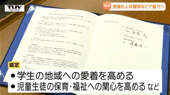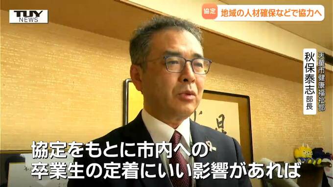 天童市健康福祉部 秋保泰志 部長「保育士の確保とか、高齢者施設につきましても、これも全国的にですが人材確保が大きな課題となっています。本日の協定をもとに市内への卒業生の定着にいい影響があればと」