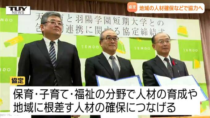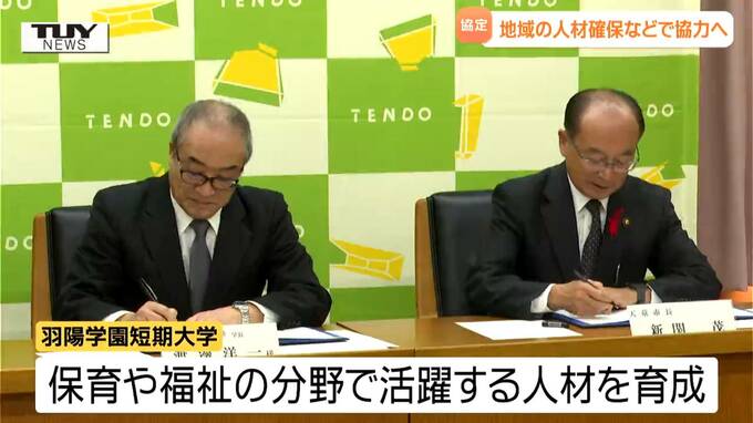 保育や福祉で活躍する人材を育てる短期大学と天童市が協定を結び、地域に根差した人材などの確保で協力していくことになりました。