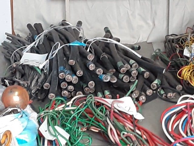 床に置かれた大量のケーブル。全て盗まれたものです。犯行に使ったとみられる工具もあります。