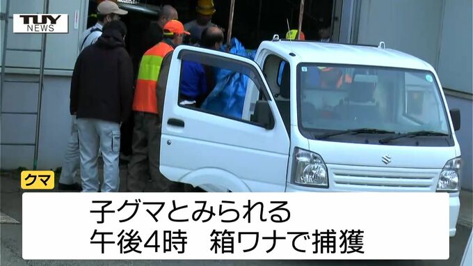 警察によりますと、車庫内に居座ったクマは子グマと見られ、猟友会が箱ワナを仕掛けた結果、午後4時にワナに入ったのが確認されました。けが人はいませんでした。