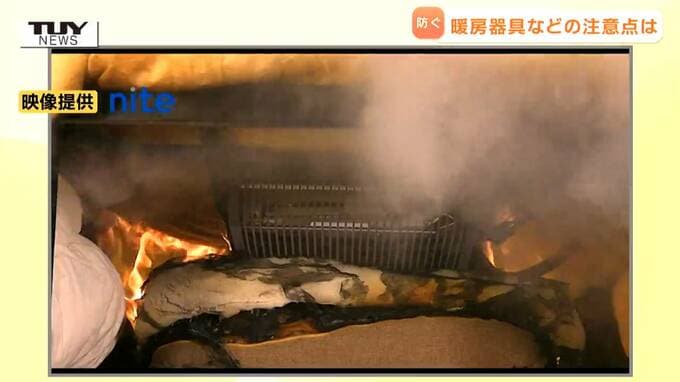 そして、こたつも使い方によっては火災を招いてしまいます。押し込んだ布団がヒーターに触れました。この状態が続くと、煙が出始め、布団が焦げ始めました。そして、出火しました。