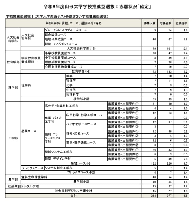 山形大学 学校推薦型選抜試験の志願状況・志願倍率を公表 令和8年度入学
