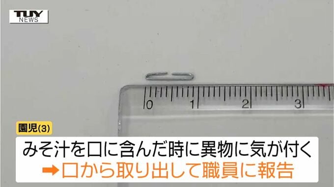 3歳児の園児1人がみそ汁を口に含んだ時に異物に気が付き、口から取り出して職員に報告したということです。
