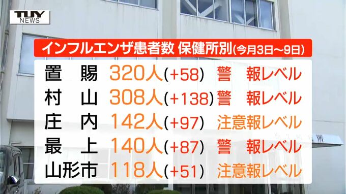 保健所別では置賜保健所で320人、村山保健所で308人、庄内保健所で142人、最上保健所で140人、山形市保健所で118人となっていて、置賜と村山、最上保健所では警報レベル。庄内と山形市保健所では注意報レベルとなっています。