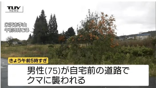 警察によりますと11日午前5時過ぎ、山形県米沢市李山で、75歳の男性が自宅前の道路を歩いていたところ、クマに襲われました。