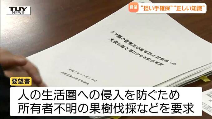 要望書にはクマ捕獲に関わる担い手確保に向けた十分な予算を捻出すること。捕獲に関連し担当者への誹謗中傷が相次いでいることを受け国民に対し有害駆除に関する正しい知識を普及させること。クマが人の生活圏に侵入することを防ぐため所有者がわからない果樹を伐採できるようにすることなどが記載され、意見が交わされました。