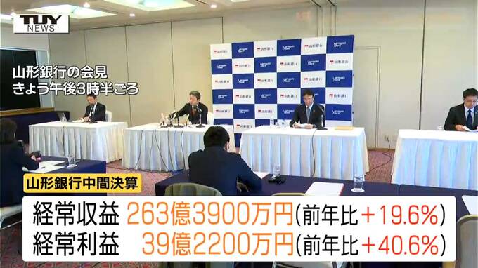 山形銀行の中間決算は、一般企業の売り上げにあたる経常収益が前年比19.6%増の263億3900万円、経常利益が前年比40.6%増の39億2200万円、中間純利益が前年比42%増の29億1200万円でした。山形銀行が増収増益となるのは3期ぶりです。
