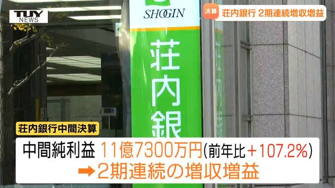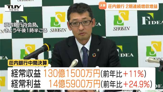 一般企業の売り上げにあたる経常収益が前年比11%増の130億1500万円、経常利益が前年比24.9%増の14億5900万円。中間純利益が、前年比107.2%増の11億7300万円でした。荘内銀行は2期連続の増収増益です。