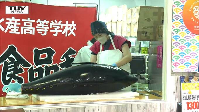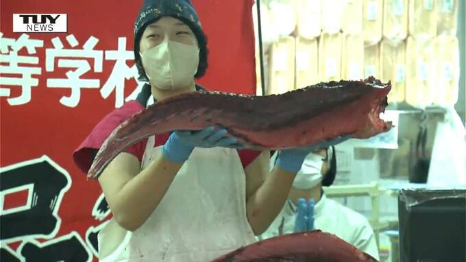 寒河江市のスーパーできょう、愛媛県の女子高校生が地元の養殖マグロをPRする解体ショーを披露しました。