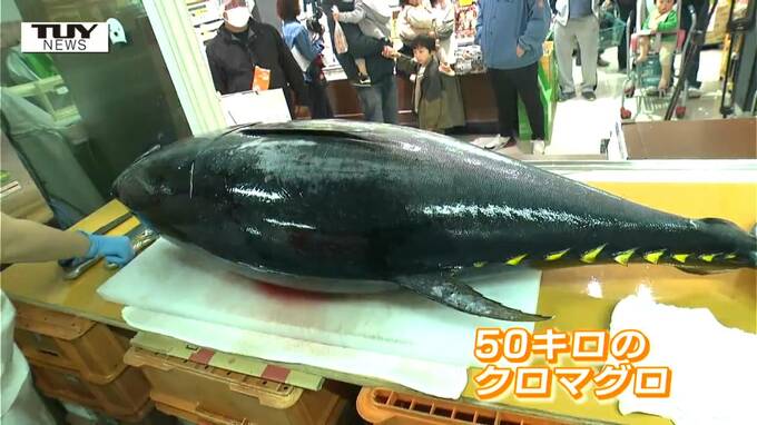 寒河江市の「フードセンターたかき元町店」で行われたのは50キロもあるクロマグロの解体ショーです。