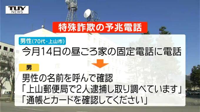 男は男性の名前を呼んで確認した後、「上山郵便局で2人逮捕し取り調べています。通帳とカードを確認してください」などと話しました。