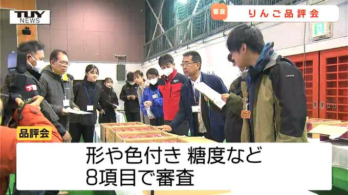 審査は形や色付き、糖度など8つの項目で行われ、審査員たちは生産者自慢のリンゴを一つひとつじっくりと見ながら、評価していました。