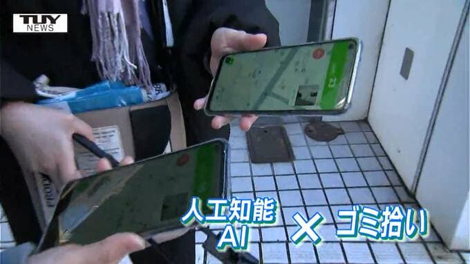 参加者が持つゴミ拾い用のトングは、人工知能AIを活用したもので、トングに付いたカメラでゴミを認識、スマートフォンで記録します。ゴミの多い場所を可視化することで、今後の活動に役立てられます。
