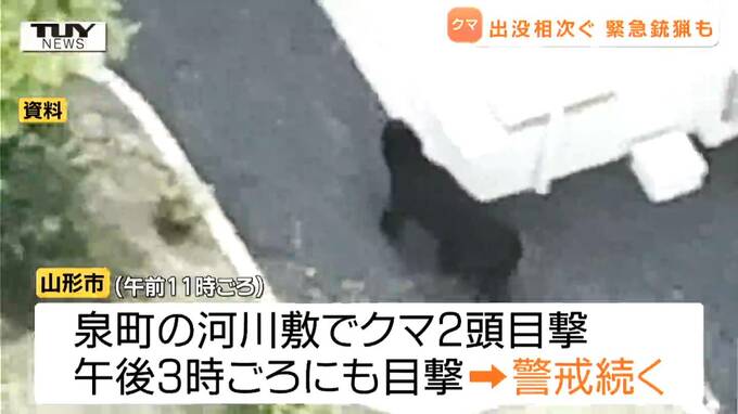 【動画】駅近くにクマ 柿の木から降りたところを緊急銃猟で駆除 県内でクマの目撃相次ぐ(山形) 2025年11月25日(火) 18:25 国内 ■山形市では河川敷に... 山形市では午前11時ごろ、泉町の河川敷でクマ2頭が目撃されました。クマは午後3時ごろにも目撃されていて、警戒が続いています。 このほか県内では寒河江市や天童市などでもクマの目撃や痕跡が確認されています。