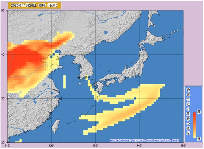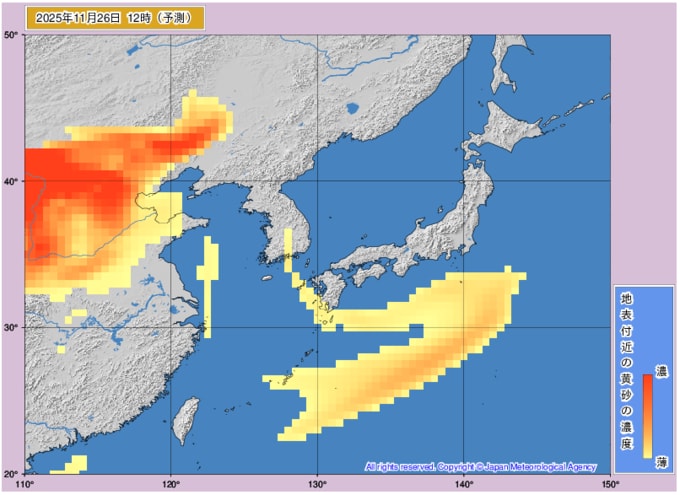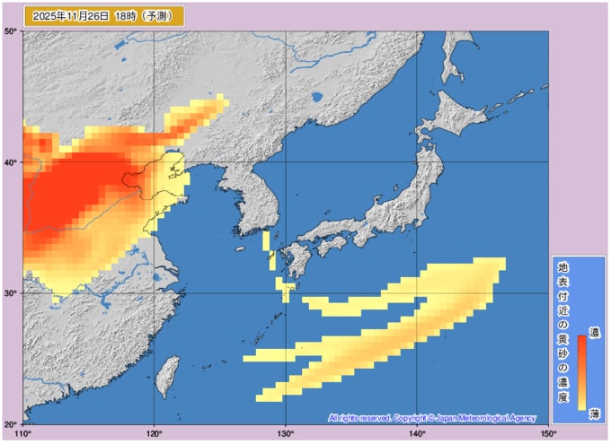 日本列島に黄砂飛来 九州から東北・北海道の一部までがすっぽり黄砂に覆われるタイミングも…黄砂はいつどこに飛んでくる? 気象庁データを見る(山形) 2025年11月26日(水) 10:23 国内 26日から28日にかけ黄砂が飛来し、日本列島全域、本州がすっぽり黄砂に覆われる可能性があり注意が必要です。 どこにいつ飛んでくるかは画像の通りです。 ■26日
