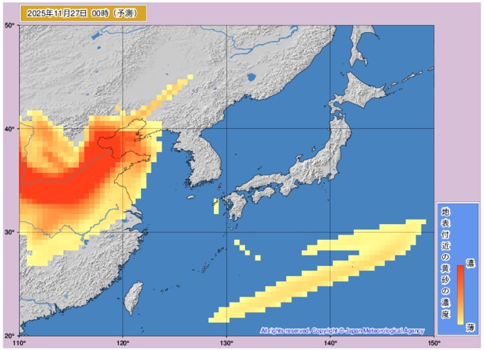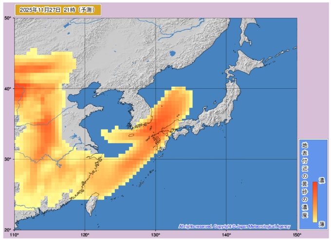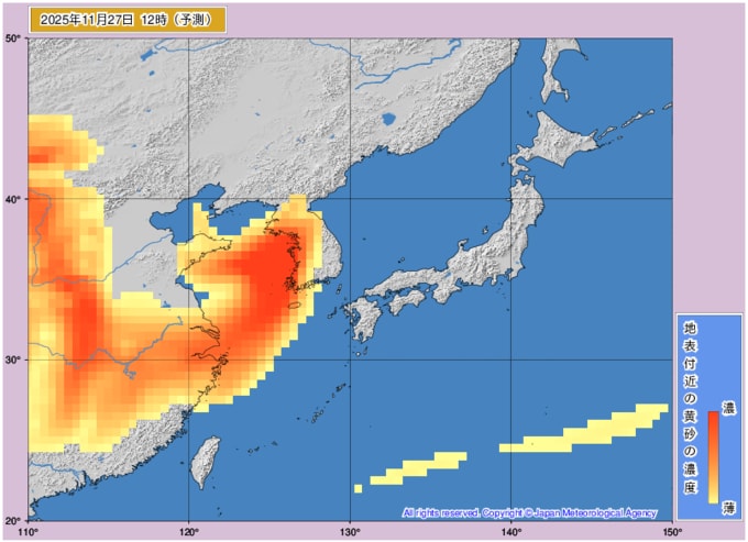 日本列島に黄砂飛来 九州から東北・北海道の一部までがすっぽり黄砂に覆われるタイミングも…黄砂はいつどこに飛んでくる? 気象庁データを見る(山形) 2025年11月26日(水) 10:23 国内 ■27日