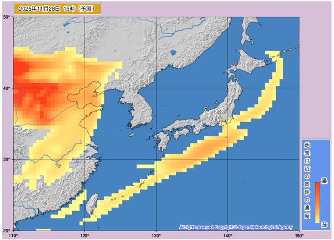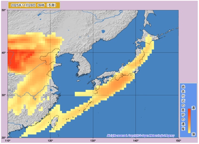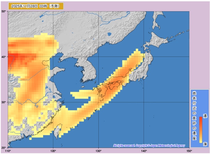 日本列島に黄砂飛来 九州から東北・北海道の一部までがすっぽり黄砂に覆われるタイミングも…黄砂はいつどこに飛んでくる? 気象庁データを見る(山形) 2025年11月26日(水) 10:23 国内 ■28日 本州がすっぽりと