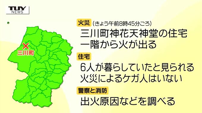 警察や消防によりますときょう午前8時45分ごろ、三川町神花天神堂の住宅の一階から火が出ていると、近隣住民から消防に通報がありました。