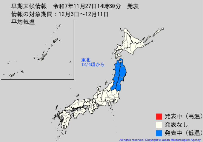 東北地方の気温は、12月3日頃までは平年並か高い日が多いですが、12月4日頃からは、冬型の気圧配置が強まり寒気の影響を受けやすくなるため、かなり低くなる可能性があります。また、12月4日頃からは、東北日本海側を中心に、この時期としては降雪量がかなり多くなる可能性があります。