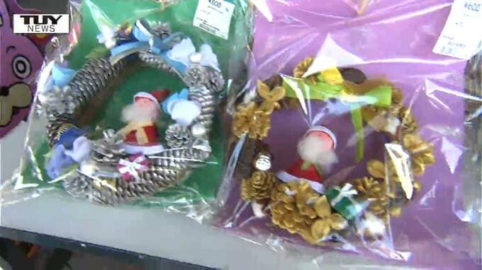 7人の生徒が5ヶ月をかけて作ったおよそ100個のクリスマスリースはすべて手作り。自分達で育てたサツマイモのツルや学校の敷地などで集めた木の実、粘土やフェルト生地を加工して飾りつけました。