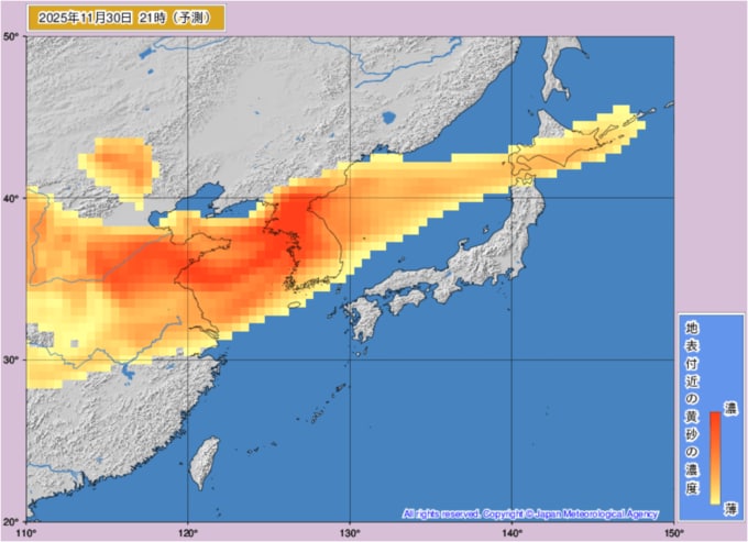 【黄砂情報】日本列島に黄砂飛来の予想 12月1日までの黄砂シミュレーション 1日は日本列島の広範囲に飛来か...黄砂を上空から見たデータで確認 気象庁発表 2025年11月28日(金) 11:59 国内 ■30日は北海道、東北に...