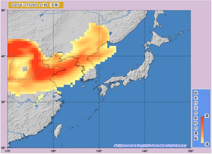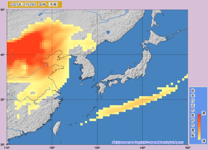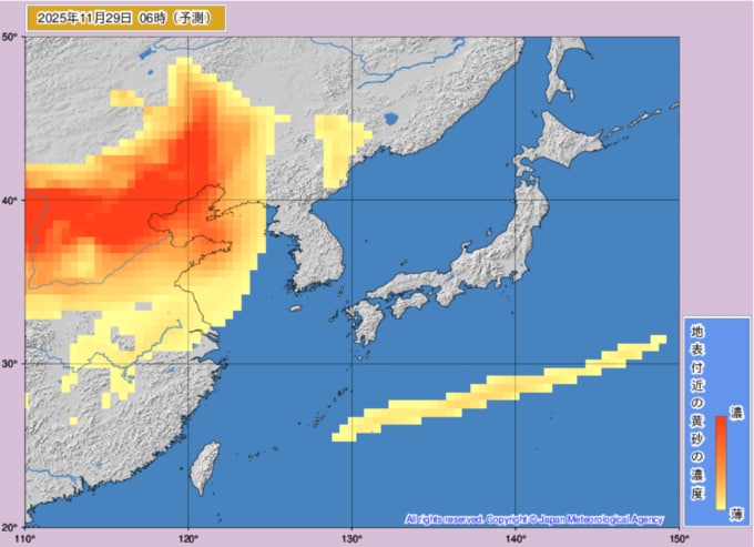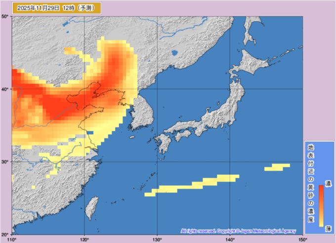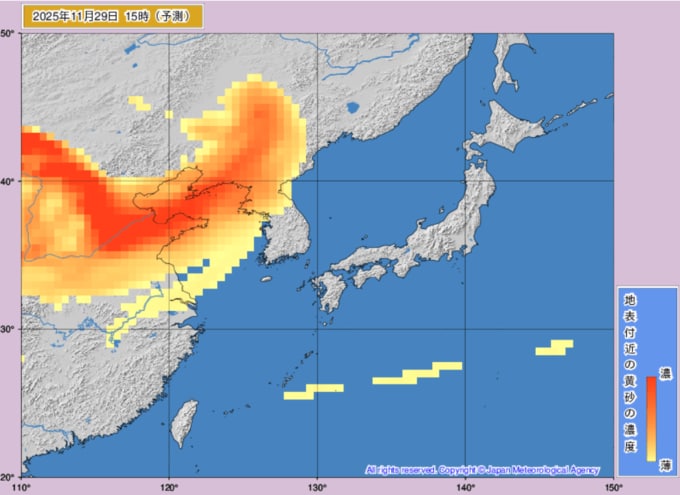 【黄砂情報】来月1日は日本列島の広範囲に黄砂飛来か...11月29日~12月1日までの黄砂シミュレーション 黄砂を上空から見たデータで確認 気象庁発表 2025年11月28日(金) 19:46 国内 ■11月29日