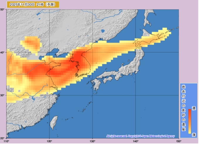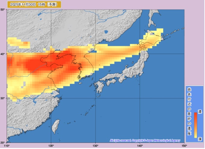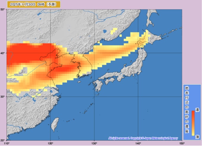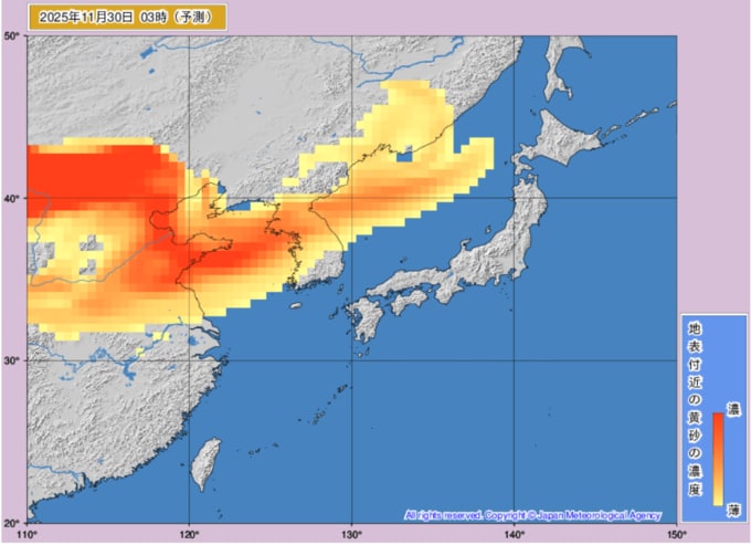 【黄砂情報】来月1日は日本列島の広範囲に黄砂飛来か...11月29日~12月1日までの黄砂シミュレーション 黄砂を上空から見たデータで確認 気象庁発表 2025年11月28日(金) 19:46 国内 ■30日は北海道、東北に黄砂が...