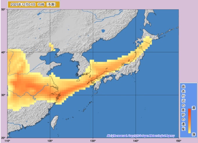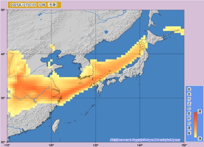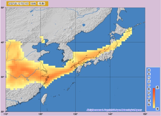 【黄砂情報】12月1日~2日にかけて日本列島の広範囲に黄砂飛来か...1日~2日までの黄砂シミュレーション 黄砂を上空から見たデータで確認 気象庁発表 2025年12月1日(月) 11:34 国内 ■1日(画像)
