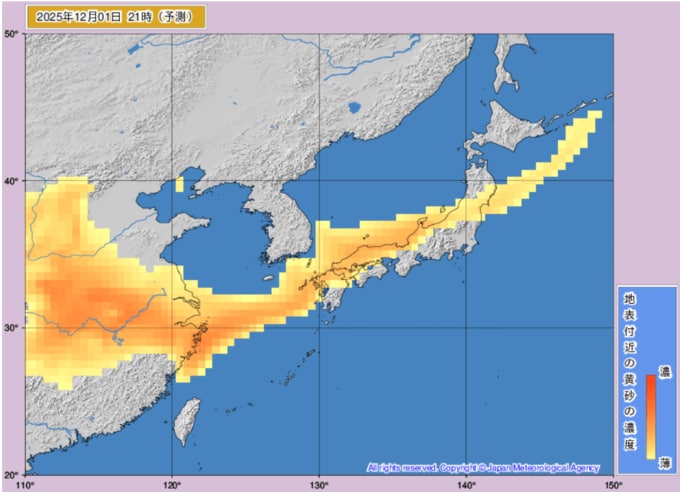 【黄砂情報】日本列島の広範囲に黄砂飛来か...1日~2日の黄砂シミュレーション 黄砂を上空から見たデータで確認 気象庁発表