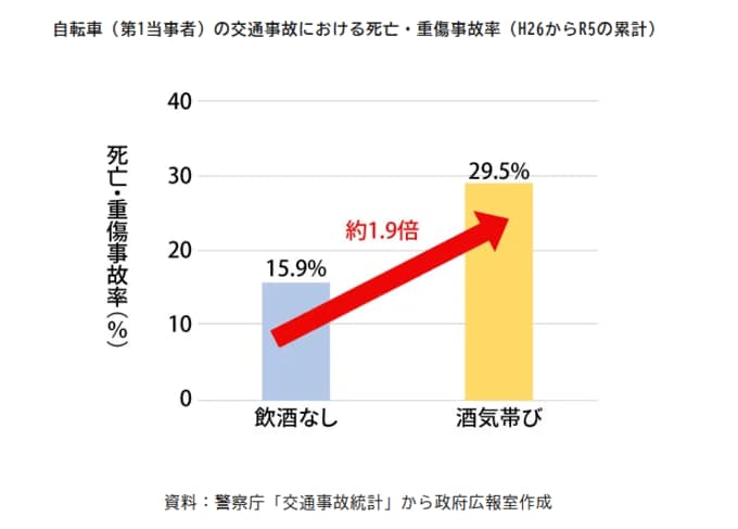 自転車の飲酒運転は、事故が起きれば命に危険が及ぶ可能性が圧倒的に高まるのです。(グラフ参照)