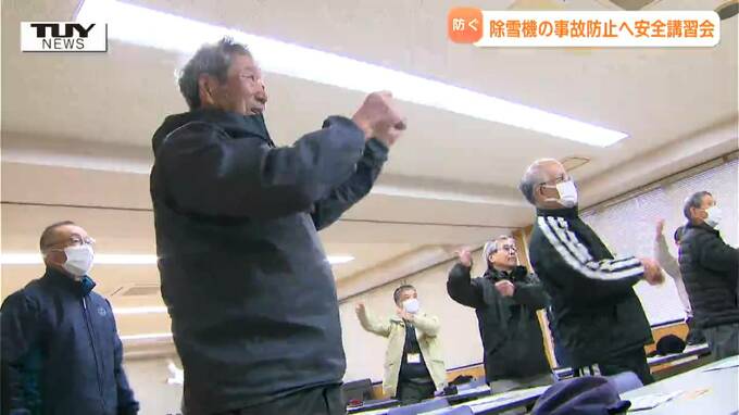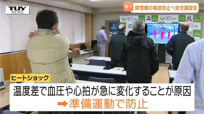 講習会で突然始まった映像に合わせて行われたのは準備体操です。これも実は安全に雪かきを行うために大切なこと。温度差で血圧や心拍が急に変化する「ヒートショック」を防ぐためのものです。
