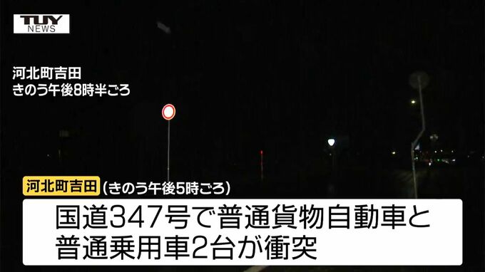 警察によりますと、きのう(3日)午後5時ごろ、山形県河北町吉田の国道347号で普通貨物自動車と普通乗用車2台が衝突する事故がありました。