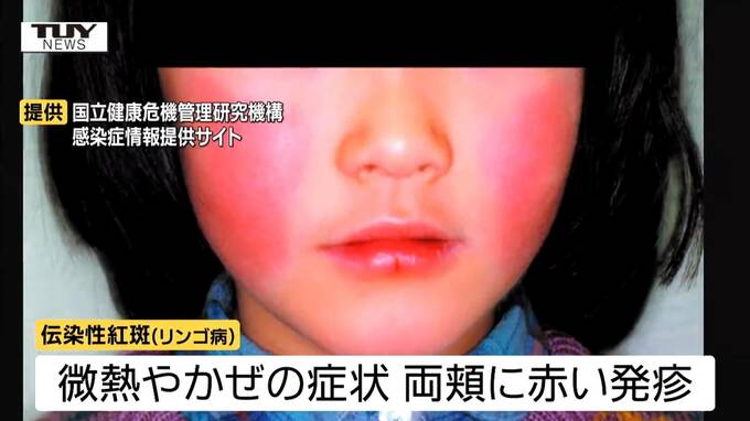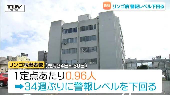 県衛生研究所によりますと、先月24日から30日までに県内26の小児科定点医療機関から報告があった「リンゴ病」の患者数は前の週より8人減少し25人でした。1定点あたりの患者数は0.96人で、34週ぶりに警報レベルを下回りました。