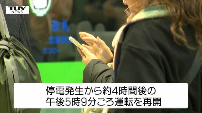 JRによりますと、係員が原因と見られる鉄道設備の箇所を見つけ、処置を行った結果、停電発生からおよそ4時間後の5時9分ごろ運転を再開したということです。