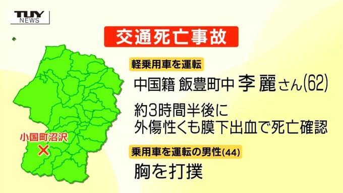 この事故で軽乗用車を運転していた中国籍で飯豊町中の李麗さん(62)が病院に運ばれましたが、およそ3時間半後に外傷性くも膜下出血のため死亡が確認されました。